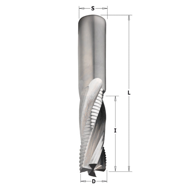 O carbură specială super microgranulară a fost creată pentru a produce și menține o muchie ascuțită. Noua spirală cu unghi mic este proiectată special pentru tăierea curată a lemnului și pentru evacuarea eficientă a talașului. Uneltele funcționează mai rece, iar muchia tăietoare rezistă mai mult. Poate fi folosit pentru tăierea și copierea lemnului masiv, compozitelor din lemn, materialelor plastice și laminatelor, dimensionării panourilor și orice frezare. Utilizați viteze mari de avans pe piese bine asigurate. Poate fi folosit în centre de prelucrare, freze CNC și freze de mână cu mandrine sau adaptoare. parametri tehnici • HWM de calitate premium. • 4 muchii de tăiere în spirală (cu 2 sparge așchii) (Z2 + 2R). • Oferă o suprafață excelentă pe partea inferioară a piesei de prelucrat. • Îndepărtarea așchiilor în sus.