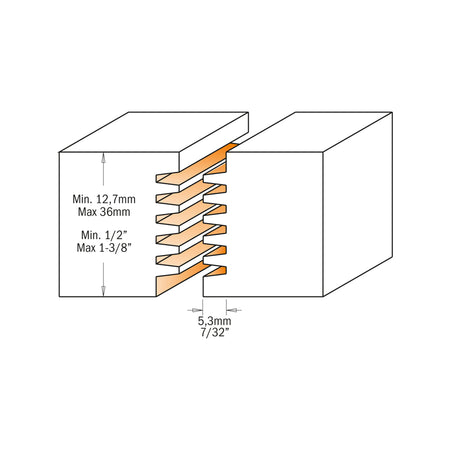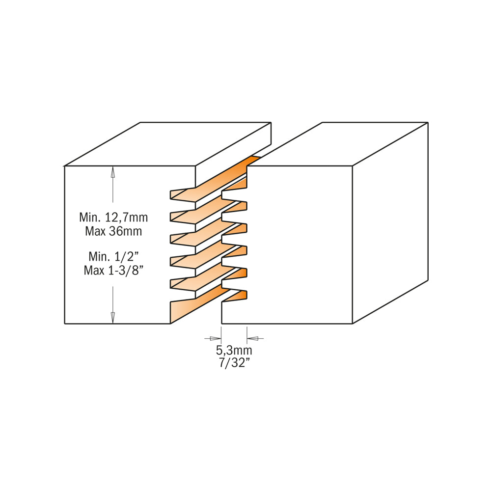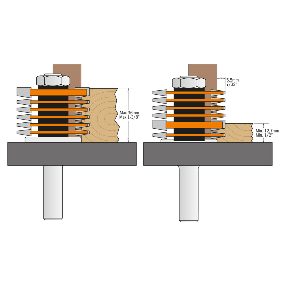 Folosind aceste freze, puteți crea îmbinări incredibil de puternice pe lățime sau lungime în lemn sau placaj. Etanșeitatea precisă și suprafața adezivă împreună creează o legătură care este de fapt mai puternică decât lemnul în sine. Unealta este disponibilă în două dimensiuni de prindere, cu dinți din carbură și șase discuri de frezat detașabile. În combinație cu acestea, puteți freza goluri între 12,7 mm și 36 mm.