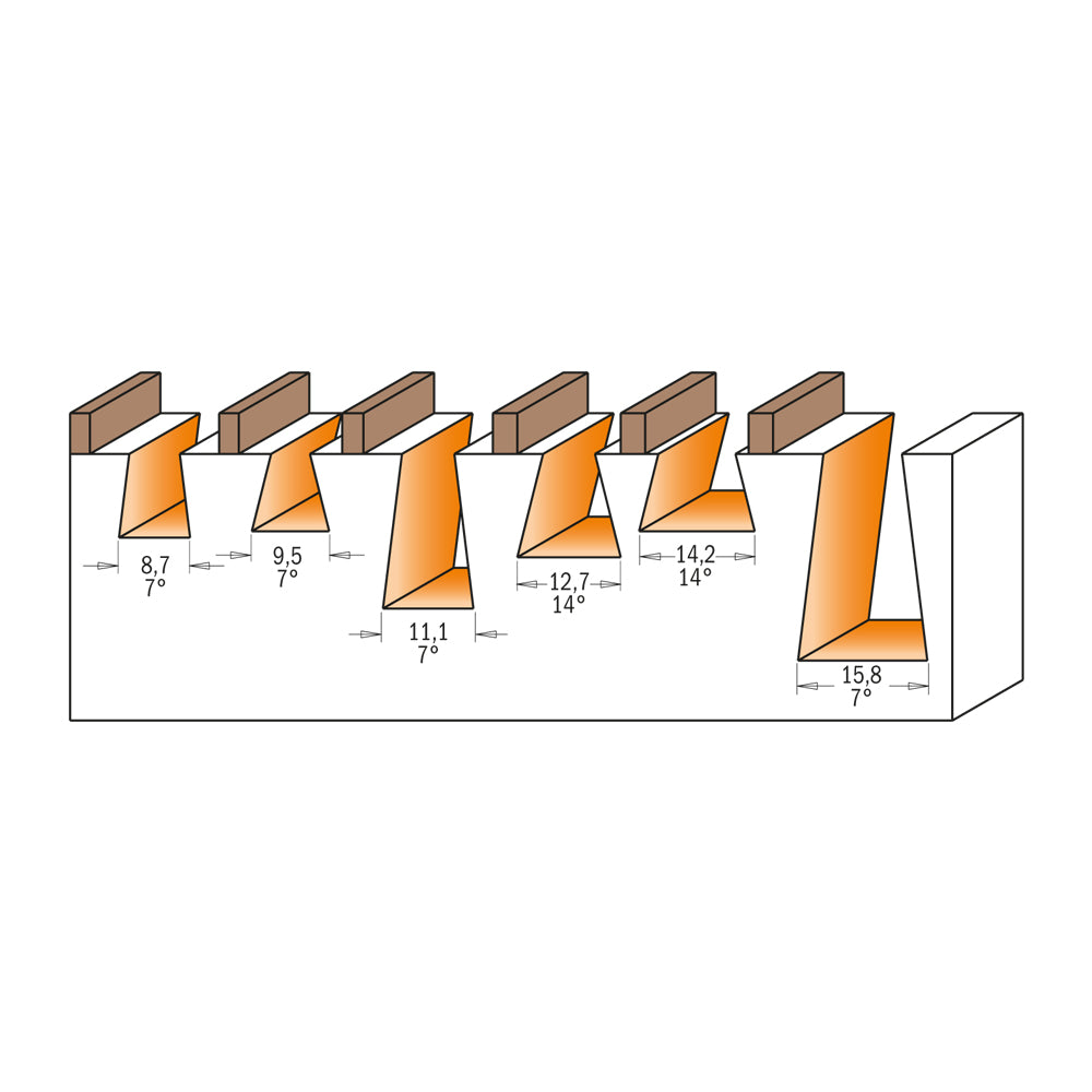 La asamblarea cutiilor și a altor structuri, avantajul îmbinării în coadă de rândunică este funcționalitatea și lipirea structurală remarcabilă. Frezele CMT sunt proiectate pentru a se potrivi tuturor mașinilor populare, inclusiv sistemele Leigh, Keller, JoinTECH și Omnijig. Cu siguranță vei găsi piesa pe care o cauți într-o gamă largă de dimensiuni și unghiuri de frezare. Înainte de a comanda, verificați lungimea completă a frezei pentru a vă asigura că obțineți dimensiunea de care aveți nevoie - CMT face unelte special pentru mașini și șabloane care necesită lungimi mai mari ale tijei. SFATURI: Se recomandă două șabloane dacă îmbinarea în coadă de rândunică este realizat cu șablon în funcție de diferitele tipuri de îmbinare. Înainte de a scoate piesa de prelucrat de pe șablon, asigurați-vă că îmbinările în coadă de rândunică sunt frezate complet și fără probleme. Pentru o frezare și mai ușoară și economisirea sculelor, prefrezați cu o unealtă dreaptă. SFATURI DE SIGURANȚĂ: Dacă unealta de frezat se blochează în timpul funcționării, reglați poziția sculei cu precizie și verificați dacă adâncimea de frezare este corectă. Nu ridicați unealtă din șablon în timp ce lucrați.