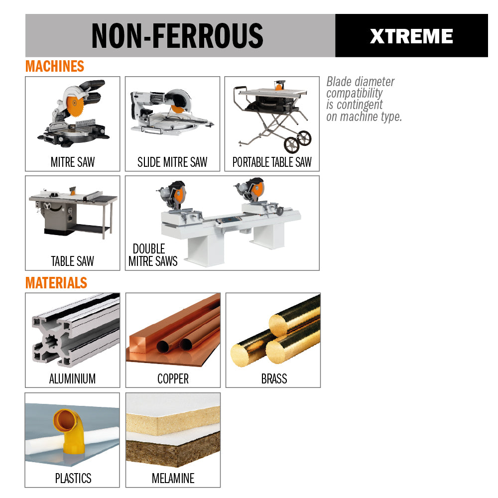 Excelent pentru tăierea țevilor, a produselor trase și a blocurilor solide pentru următoarele materiale: aluminiu, alamă, aliaje de cupru, plastic, material compozit, melamină și panouri laminate.