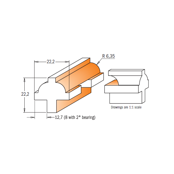 Datorită rulmenților de ghidare, puteți crea și lamele curbate. Designul unic al insertului de scule vă permite să creați șipci de lungime completă cu joncțiuni puternice. Aceste kituri sunt concepute pentru lamele de 22,2 mm lățime, cum ar fi ușile dulapurilor de colț.